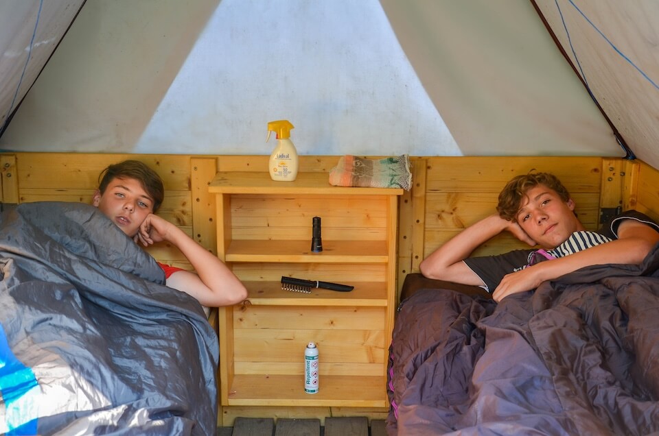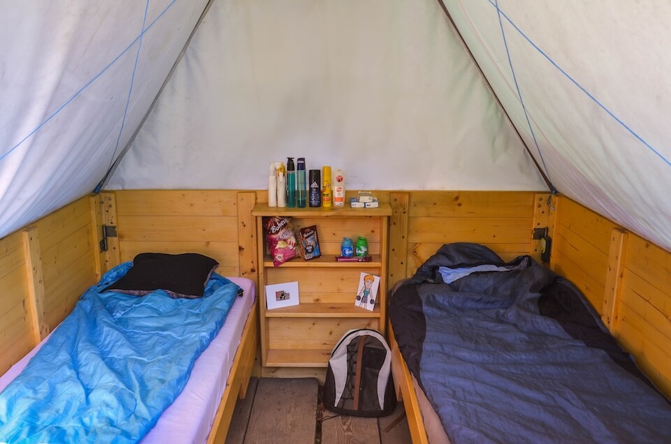 - Děti bydlí po dvou, ve stanech s podsadou, které mají pevné lůžko s matrací, podlážku, stolek a poličku.